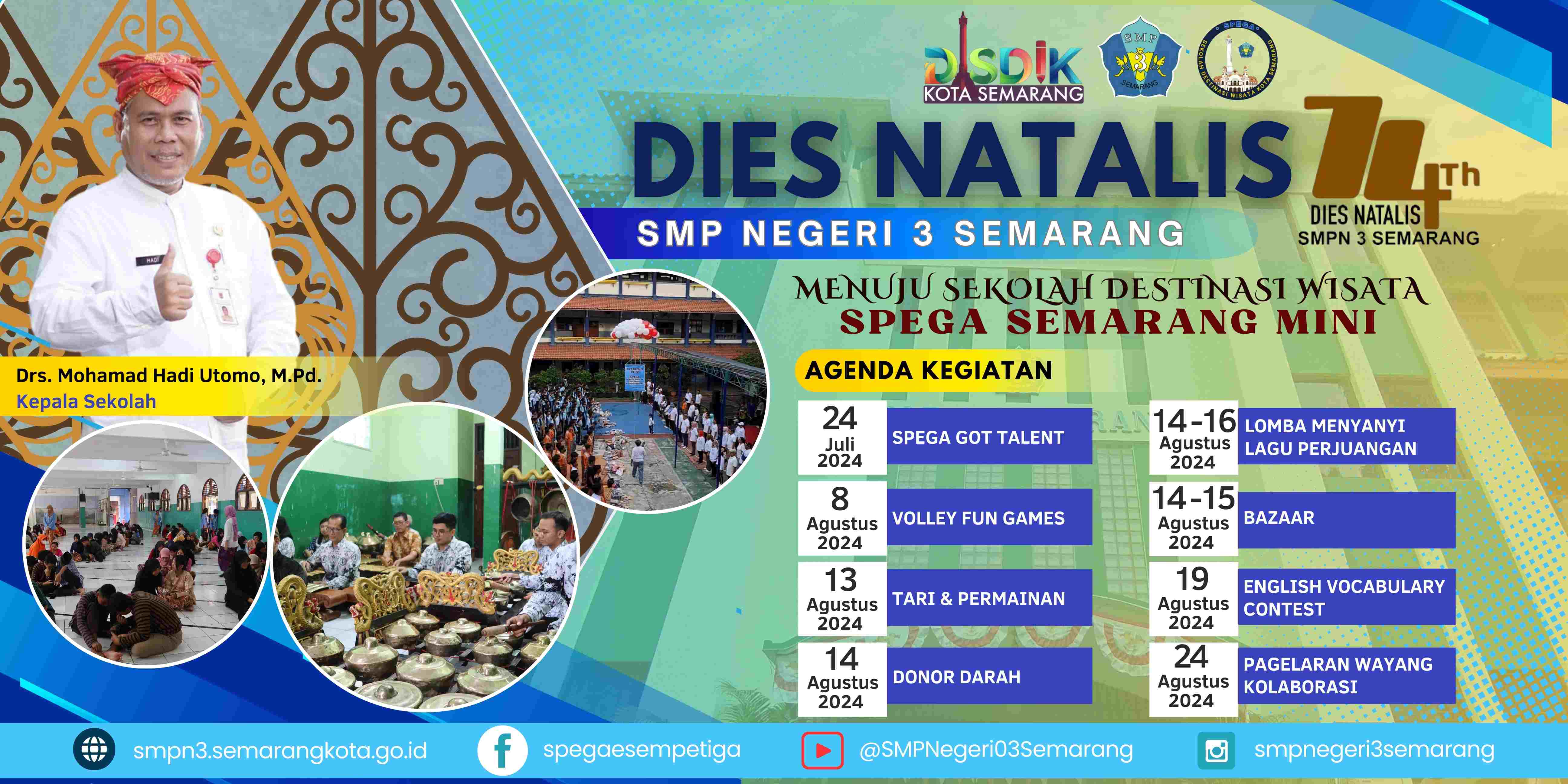 Puji syukur kita pajatkan kepada Allah swt., Tuhan Yang Maha Esa yang telah memberikan rahmat-Nya sehingga SMP Negeri 3 Semarang memiliki website resmi yang dapat diakses masyarakat luas. Website ini bertujuan untuk menyediakan kebutuhan masyarakat berkaitan dengan informasi sekolah, baik informasi tentang siswa, guru, karyawan, aktivitas, sarana prasarana, beserta prestasi-prestasinya.
