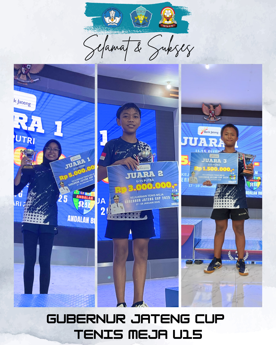 SMP Negeri 3 Semarang kembali menorehkan prestasi gemilang dalam ajang olahraga. Pada Kejuaraan Tenis Meja Gubernur Cup Jateng 2025 kategori U15, tiga peserta didik berhasil meraih juara dalam kompetisi yang berlangsung pada tanggal 17-19 Januari 2025.